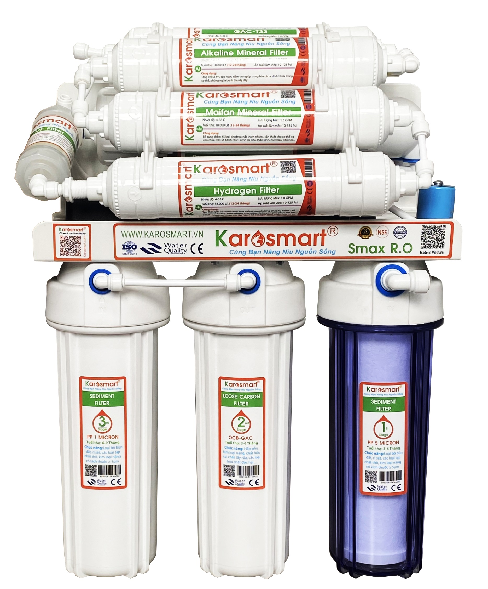 Màng RO Made in USA: chính hãng từ Karosmart, được nghiên cứu kỹ lưỡng, phù hợp với đặc thù nguồn nước tại Việt Nam,giúp tăng thời gian lượng nước tinh khiết với công suất lên đến 15 lit/giờ, tăng tuổi thọ màng lọc và các bộ phận điện của máy.